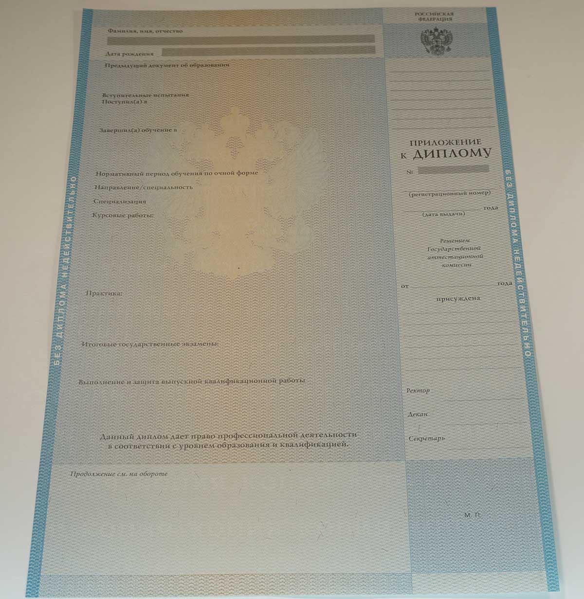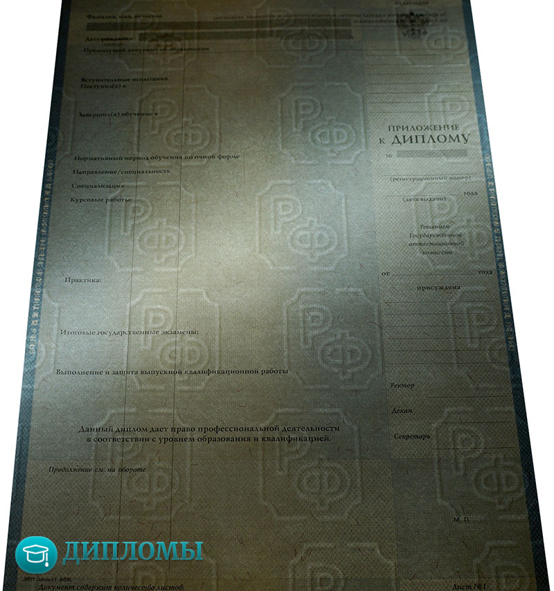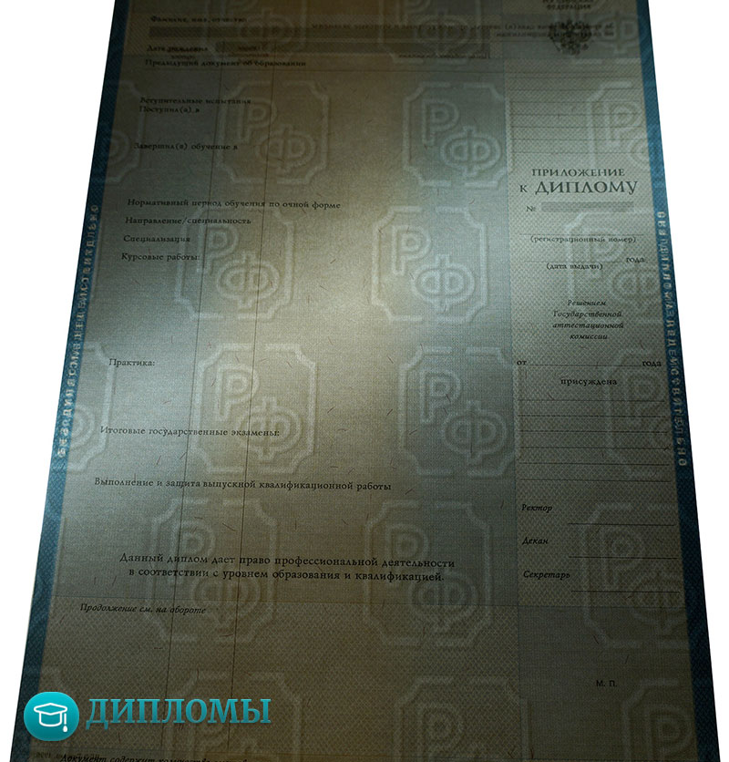 Дипломы изготавливаются на государственных бланках, имеют высокое качество и защитные элементы. Компания RusDiplomy сотрудничает с большим количеством ВУЗов в стране, поэтому не является проблемой получить бланки конкретного учебного заведения, с подписями от уполномоченных сотрудников.